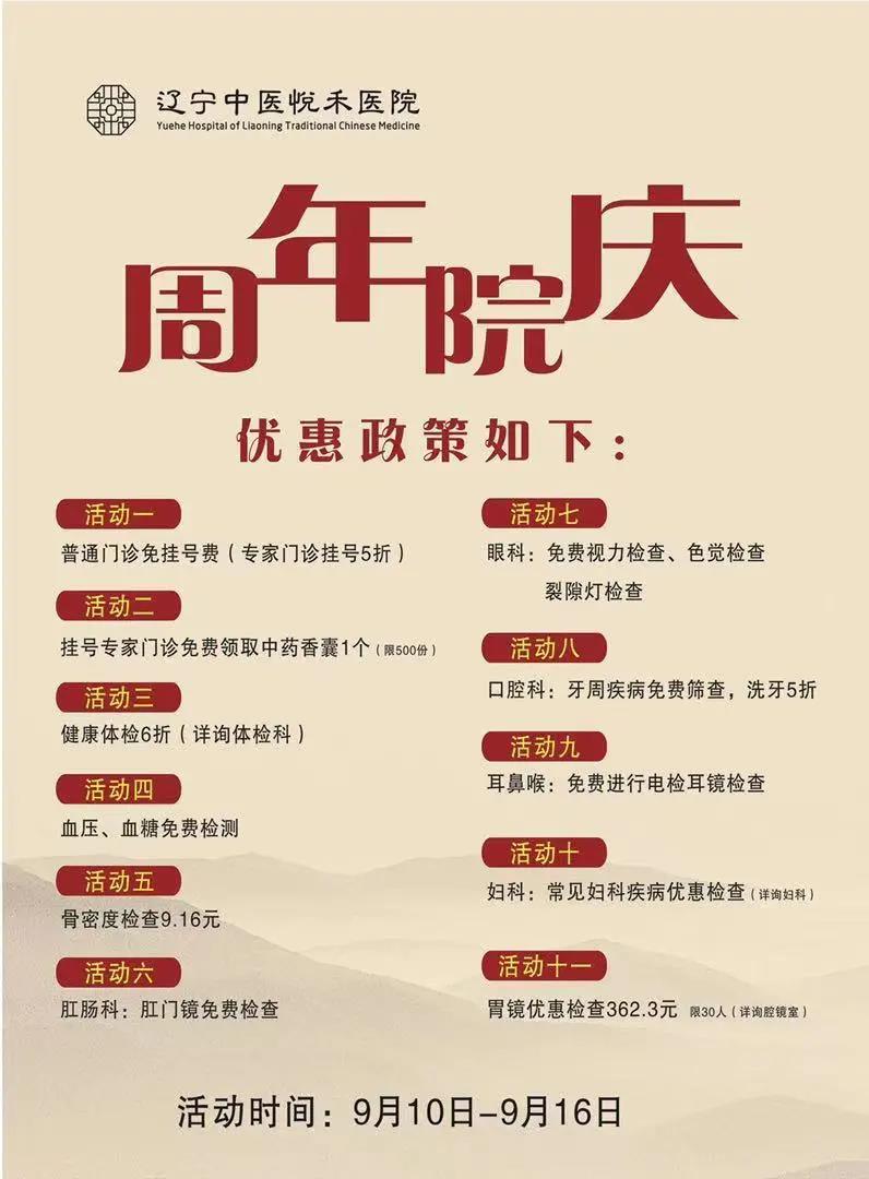 辽宁中医悦禾医院两周年院庆惠民活动隆重来袭!