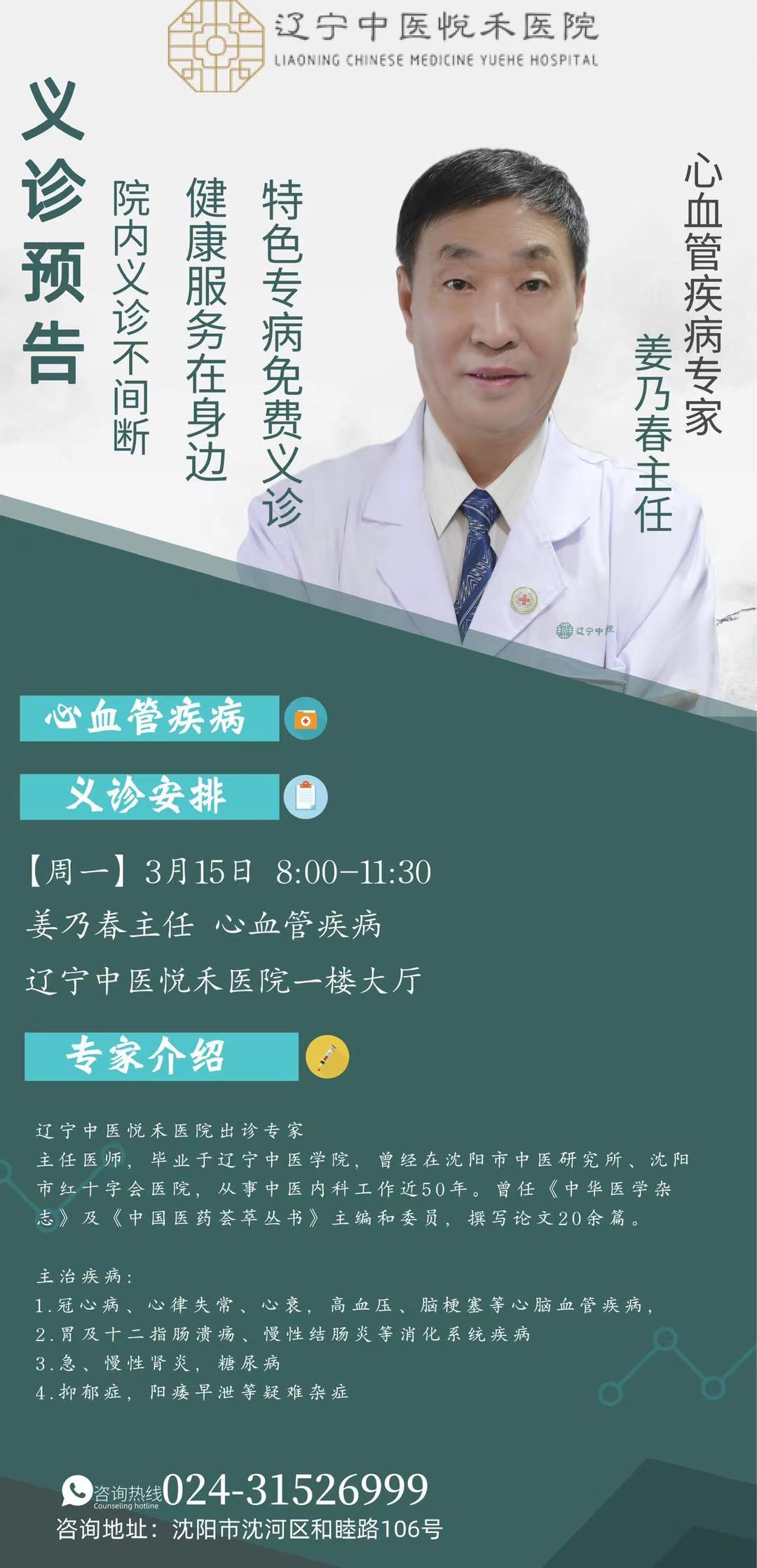 3月15日辽宁中医悦禾医院举办院内特色专病义诊活动!