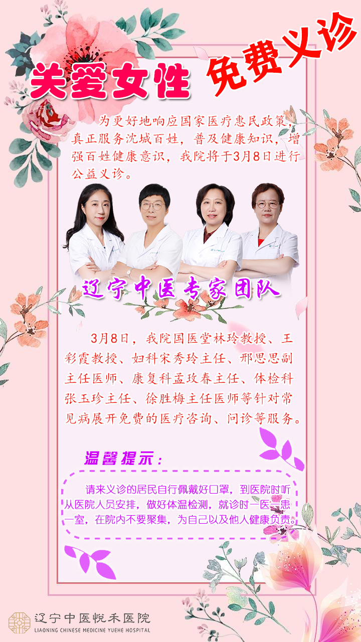 【辽宁中医悦禾医院】关爱女性,3月8日免费义诊